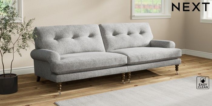 7.2.10 Erin Buttoned Back Deep Relaxed Sit 4 Seater Large Sofa Chunky Boucle Easy Clean Light Grey High Classic Turned Chrome Castor - Mid | Made Click here to use our website with more accessibility support, for example screen readers