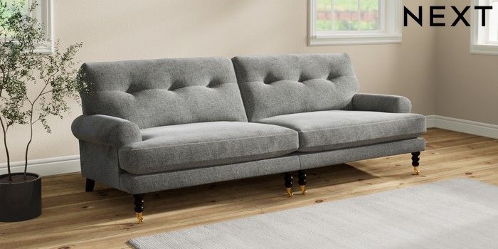 7.2.10 Erin Buttoned Back Deep Relaxed Sit 4 Seater Large Sofa Chunky Chenille Dark Grey High Classic Turned Brass Castor - Dark | Made Click here to use our website with more accessibility support, for example screen readers