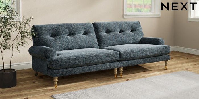 7.2.10 Erin Buttoned Back Deep Relaxed Sit 4 Seater Large Sofa Chunky Chenille Dark Navy Blue High Classic Turned Brass Castor - Light | Made Click here to use our website with more accessibility support, for example screen readers