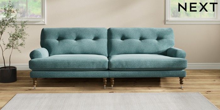 7.2.10 Erin Buttoned Back Deep Relaxed Sit 4 Seater Large Sofa Chunky Chenille Mid Teal Green High Classic Turned Chrome Castor - Mid | Made Click here to use our website with more accessibility support, for example screen readers