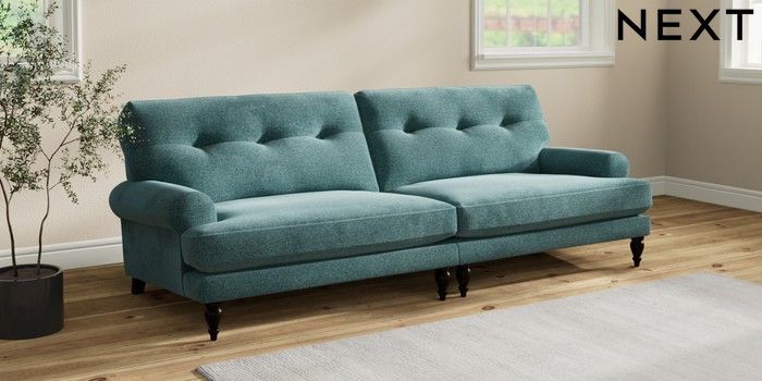 7.2.10 Erin Buttoned Back Deep Relaxed Sit 4 Seater Large Sofa Chunky Chenille Mid Teal Green High Classic Turned - Dark | Made Click here to use our website with more accessibility support, for example screen readers