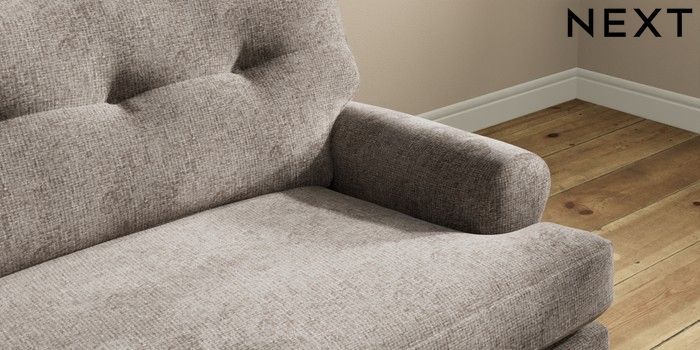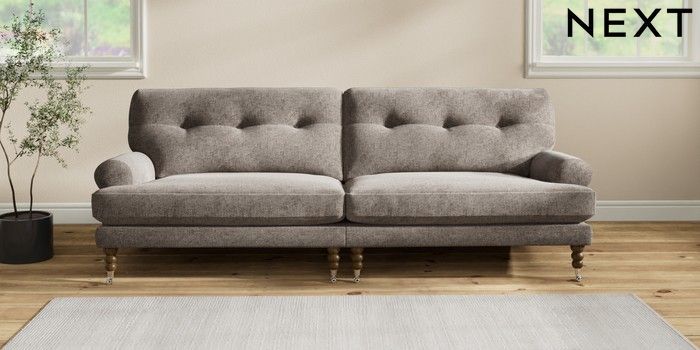 7.2.10 Erin Buttoned Back Deep Relaxed Sit 4 Seater Large Sofa Chunky Chenille Mink Brown High Classic Turned Chrome Castor - Mid | Made Click here to use our website with more accessibility support, for example screen readers