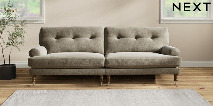 7.2.10 Erin Buttoned Back Deep Relaxed Sit 4 Seater Large Sofa Chunky Marl Light Olive Green High Classic Turned Chrome Castor - Mid | Made Click here to use our website with more accessibility support, for example screen readers