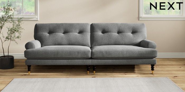 7.2.10 Erin Buttoned Back Deep Relaxed Sit 4 Seater Large Sofa Chunky Texture Dark Grey High Classic Turned Brass Castor - Dark | Made Click here to use our website with more accessibility support, for example screen readers