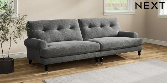 7.2.10 Erin Buttoned Back Deep Relaxed Sit 4 Seater Large Sofa Chunky Texture Dark Grey High Classic Turned Chrome Castor - Dark | Made Click here to use our website with more accessibility support, for example screen readers