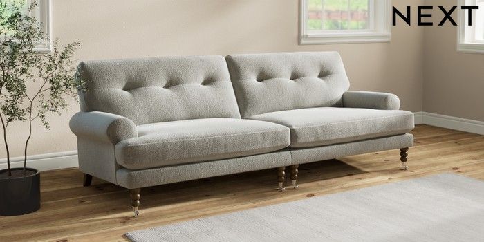 7.2.10 Erin Buttoned Back Deep Relaxed Sit 4 Seater Large Sofa Chunky Texture Dove High Classic Turned Chrome Castor - Mid | Made Click here to use our website with more accessibility support, for example screen readers