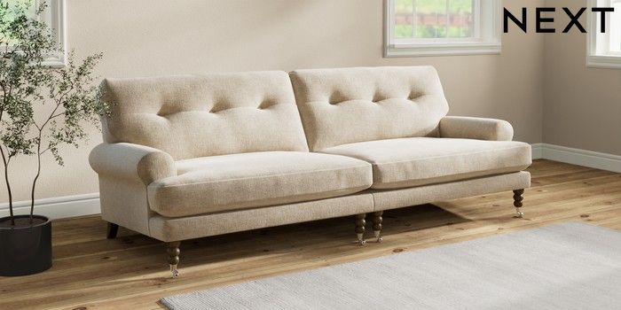 7.2.10 Erin Buttoned Back Deep Relaxed Sit 4 Seater Large Sofa Chunky Weave Cream High Classic Turned Chrome Castor - Mid | Made Click here to use our website with more accessibility support, for example screen readers
