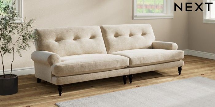 7.2.10 Erin Buttoned Back Deep Relaxed Sit 4 Seater Large Sofa Chunky Weave Cream High Classic Turned - Dark | Made Click here to use our website with more accessibility support, for example screen readers