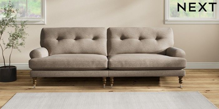 7.2.10 Erin Buttoned Back Deep Relaxed Sit 4 Seater Large Sofa Chunky Weave Dark Natural High Classic Turned Chrome Castor - Mid | Made Click here to use our website with more accessibility support, for example screen readers