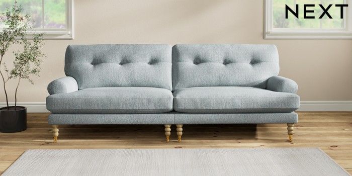 7.2.10 Erin Buttoned Back Deep Relaxed Sit 4 Seater Large Sofa Chunky Weave Mid Blue High Classic Turned Brass Castor - Light | Made Click here to use our website with more accessibility support, for example screen readers