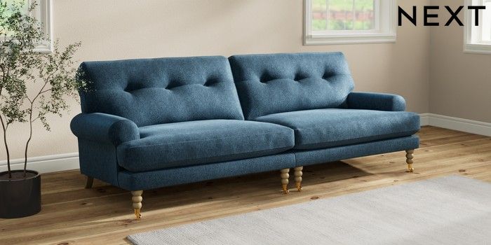 7.2.10 Erin Buttoned Back Deep Relaxed Sit 4 Seater Large Sofa Cotswold Chenille Dark Blue High Classic Turned Brass Castor - Light | Made Click here to use our website with more accessibility support, for example screen readers