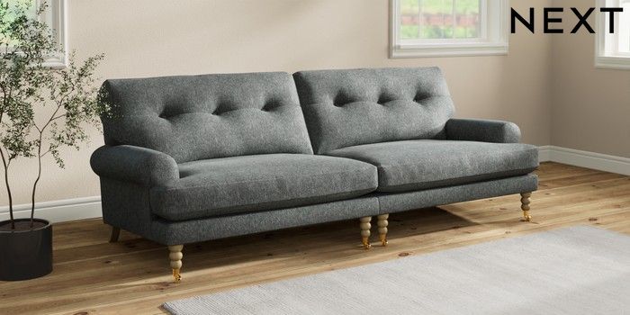 7.2.10 Erin Buttoned Back Deep Relaxed Sit 4 Seater Large Sofa Cotswold Chenille Dark Grey High Classic Turned Brass Castor - Light | Made Click here to use our website with more accessibility support, for example screen readers