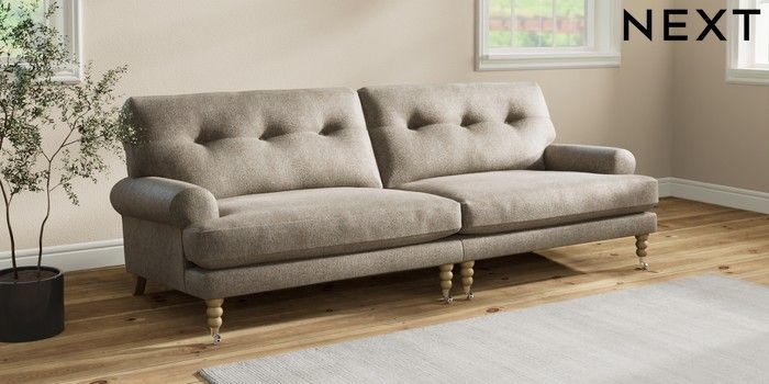 7.2.10 Erin Buttoned Back Deep Relaxed Sit 4 Seater Large Sofa Cotswold Chenille Mid Mink Brown High Classic Turned Chrome Castor - Light | Made Click here to use our website with more accessibility support, for example screen readers