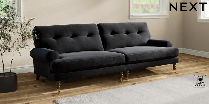 7.2.10 Erin Buttoned Back Deep Relaxed Sit 4 Seater Large Sofa Fine Chenille Easy Clean Black High Classic Turned Brass Castor - Mid | Made Click here to use our website with more accessibility support, for example screen readers