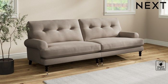 7.2.10 Erin Buttoned Back Deep Relaxed Sit 4 Seater Large Sofa Fine Chenille Easy Clean Mid Taupe Brown High Classic Turned Chrome Castor - Dark | Made Click here to use our website with more accessibility support, for example screen readers
