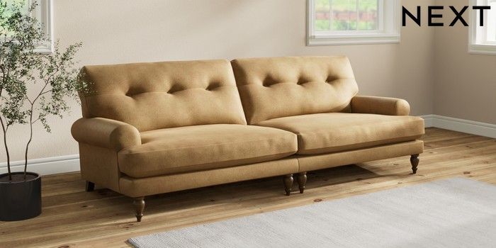 7.2.10 Erin Buttoned Back Deep Relaxed Sit 4 Seater Large Sofa Luxe Chenille Honey Yellow High Classic Turned - Mid | Made Click here to use our website with more accessibility support, for example screen readers