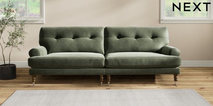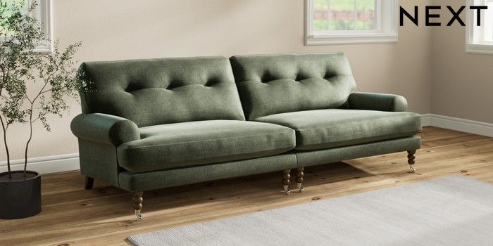7.2.10 Erin Buttoned Back Deep Relaxed Sit 4 Seater Large Sofa Luxe Chenille Mid Green High Classic Turned Chrome Castor - Mid | Made Click here to use our website with more accessibility support, for example screen readers