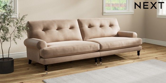 7.2.10 Erin Buttoned Back Deep Relaxed Sit 4 Seater Large Sofa Luxe Chenille Mid Natural High Classic Turned Chrome Castor - Dark | Made Click here to use our website with more accessibility support, for example screen readers