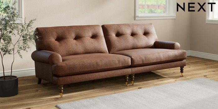 7.2.10 Erin Buttoned Back Deep Relaxed Sit 4 Seater Large Sofa Monza Faux Leather Easy Clean Chestnut Brown High Classic Turned Brass Castor - Mid | Made Click here to use our website with more accessibility support, for example screen readers