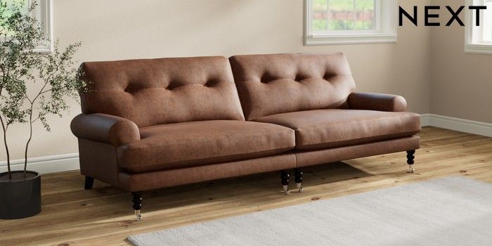 7.2.10 Erin Buttoned Back Deep Relaxed Sit 4 Seater Large Sofa Monza Faux Leather Easy Clean Chestnut Brown High Classic Turned Chrome Castor - Dark | Made Click here to use our website with more accessibility support, for example screen readers