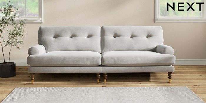 7.2.10 Erin Buttoned Back Deep Relaxed Sit 4 Seater Large Sofa Natural Mix Light Grey High Classic Turned Brass Castor - Mid | Made Click here to use our website with more accessibility support, for example screen readers