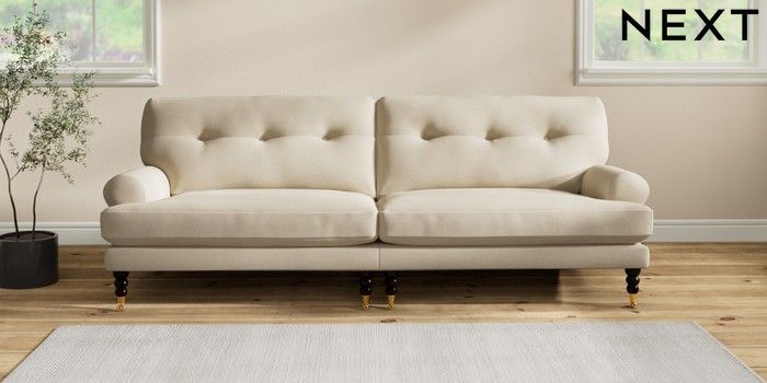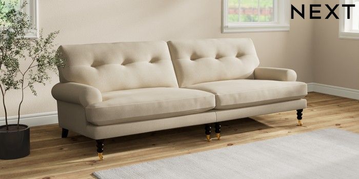 7.2.10 Erin Buttoned Back Deep Relaxed Sit 4 Seater Large Sofa Natural Mix Light Natural High Classic Turned Brass Castor - Dark | Made Click here to use our website with more accessibility support, for example screen readers