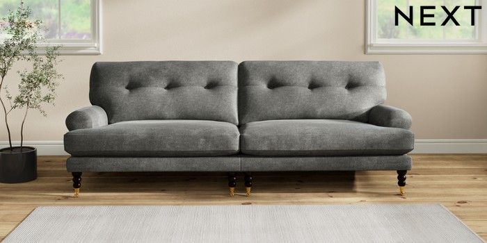 7.2.10 Erin Buttoned Back Deep Relaxed Sit 4 Seater Large Sofa Plush Chenille Dark Grey High Classic Turned Brass Castor - Dark | Made Click here to use our website with more accessibility support, for example screen readers