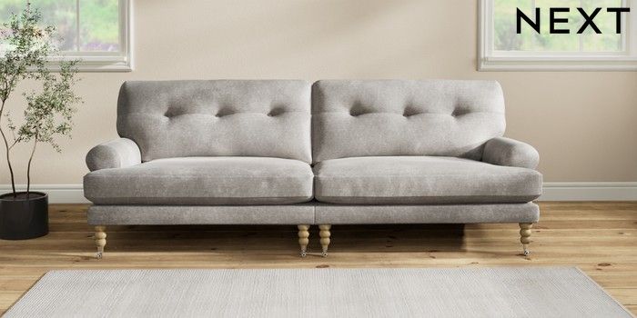 7.2.10 Erin Buttoned Back Deep Relaxed Sit 4 Seater Large Sofa Plush Chenille Light Grey High Classic Turned Chrome Castor - Light | Made Click here to use our website with more accessibility support, for example screen readers