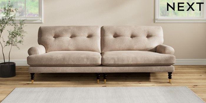 7.2.10 Erin Buttoned Back Deep Relaxed Sit 4 Seater Large Sofa Plush Chenille Mid Natural High Classic Turned Brass Castor - Dark | Made Click here to use our website with more accessibility support, for example screen readers