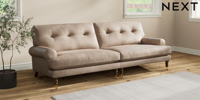 7.2.10 Erin Buttoned Back Deep Relaxed Sit 4 Seater Large Sofa Plush Chenille Mid Natural High Classic Turned Brass Castor - Mid | Made Click here to use our website with more accessibility support, for example screen readers