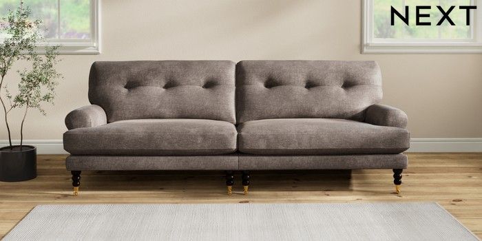 7.2.10 Erin Buttoned Back Deep Relaxed Sit 4 Seater Large Sofa Plush Chenille Mink Brown High Classic Turned Brass Castor - Dark | Made Click here to use our website with more accessibility support, for example screen readers