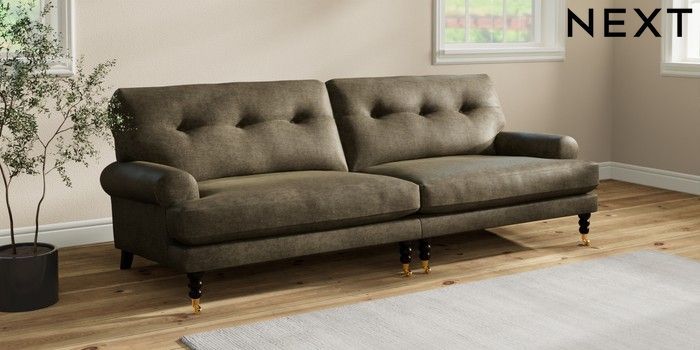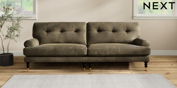 7.2.10 Erin Buttoned Back Deep Relaxed Sit 4 Seater Large Sofa Plush Chenille Moss Green High Classic Turned Brass Castor - Dark | Made Click here to use our website with more accessibility support, for example screen readers