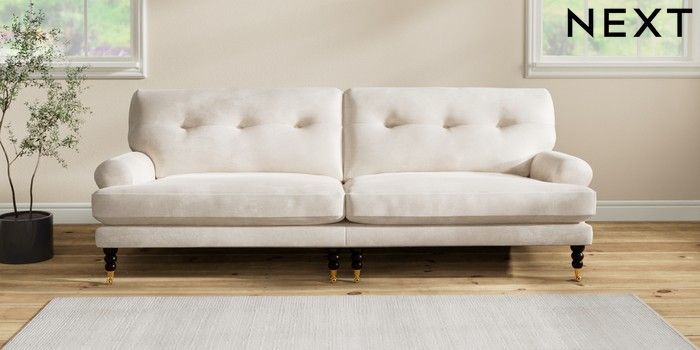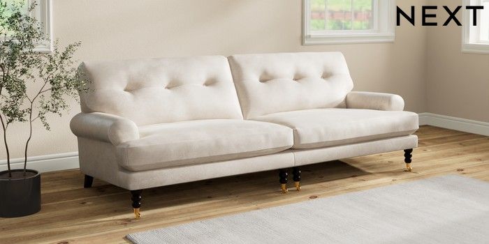 7.2.10 Erin Buttoned Back Deep Relaxed Sit 4 Seater Large Sofa Plush Chenille Oyster High Classic Turned Brass Castor - Dark | Made Click here to use our website with more accessibility support, for example screen readers