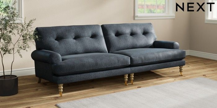 7.2.10 Erin Buttoned Back Deep Relaxed Sit 4 Seater Large Sofa Plush Chenille Slate Blue High Classic Turned Brass Castor - Light | Made Click here to use our website with more accessibility support, for example screen readers