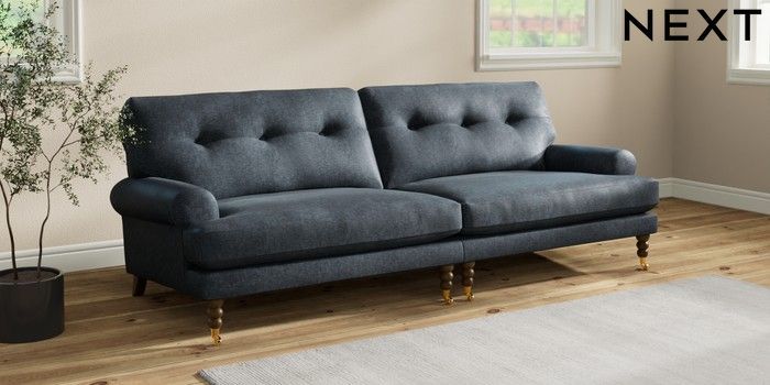 7.2.10 Erin Buttoned Back Deep Relaxed Sit 4 Seater Large Sofa Plush Chenille Slate Blue High Classic Turned Brass Castor - Mid | Made Click here to use our website with more accessibility support, for example screen readers