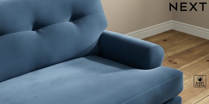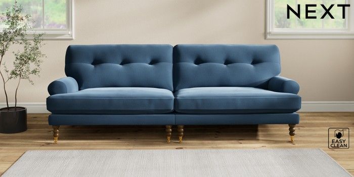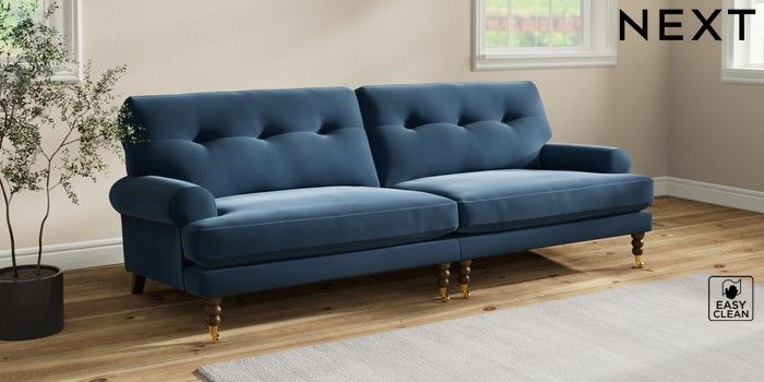 7.2.10 Erin Buttoned Back Deep Relaxed Sit 4 Seater Large Sofa Plush Velvet Easy Clean Airforce Blue High Classic Turned Brass Castor - Mid | Made Click here to use our website with more accessibility support, for example screen readers