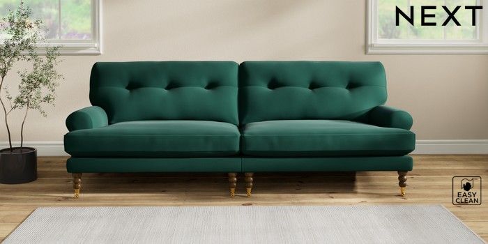 7.2.10 Erin Buttoned Back Deep Relaxed Sit 4 Seater Large Sofa Plush Velvet Easy Clean Bottle Green High Classic Turned Brass Castor - Mid | Made Click here to use our website with more accessibility support, for example screen readers