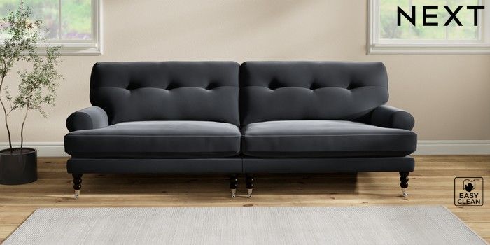 7.2.10 Erin Buttoned Back Deep Relaxed Sit 4 Seater Large Sofa Plush Velvet Easy Clean Charcoal Grey High Classic Turned Chrome Castor - Dark | Made Click here to use our website with more accessibility support, for example screen readers