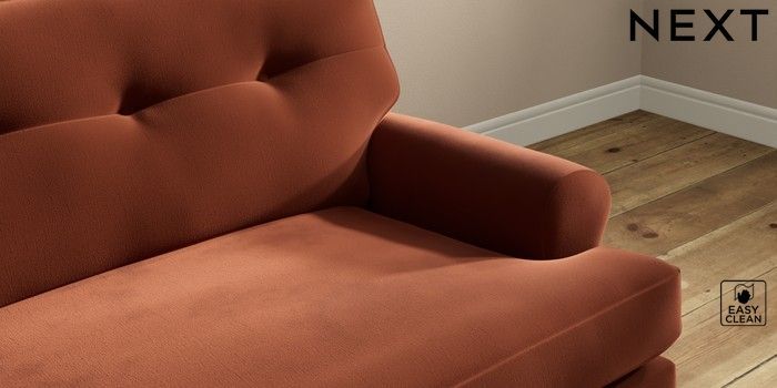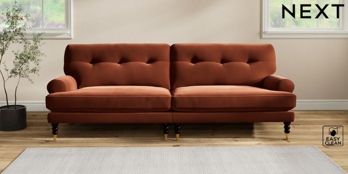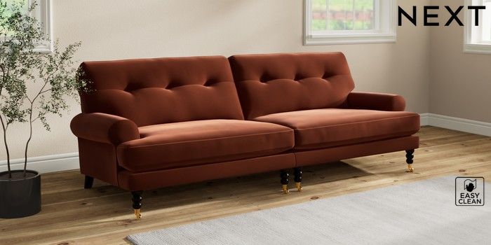 7.2.10 Erin Buttoned Back Deep Relaxed Sit 4 Seater Large Sofa Plush Velvet Easy Clean Ginger Orange High Classic Turned Brass Castor - Dark | Made Click here to use our website with more accessibility support, for example screen readers