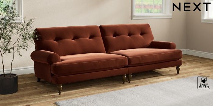 7.2.10 Erin Buttoned Back Deep Relaxed Sit 4 Seater Large Sofa Plush Velvet Easy Clean Ginger Orange High Classic Turned - Mid | Made Click here to use our website with more accessibility support, for example screen readers