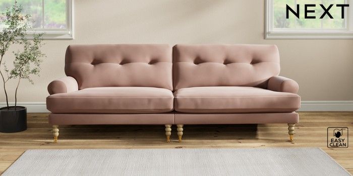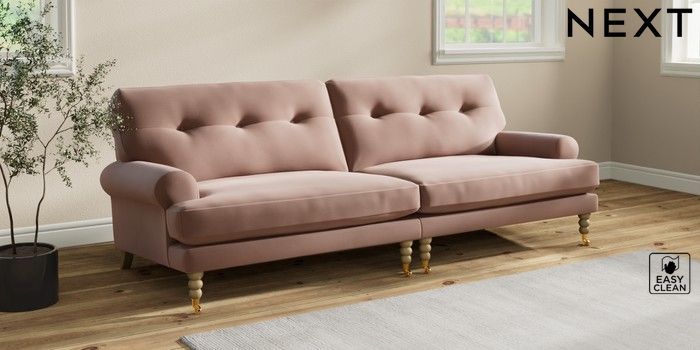 7.2.10 Erin Buttoned Back Deep Relaxed Sit 4 Seater Large Sofa Plush Velvet Easy Clean Mid Natural High Classic Turned Brass Castor - Light | Made Click here to use our website with more accessibility support, for example screen readers