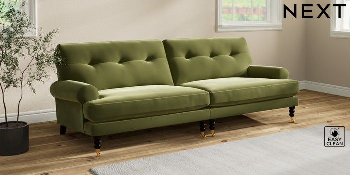 7.2.10 Erin Buttoned Back Deep Relaxed Sit 4 Seater Large Sofa Plush Velvet Easy Clean Mid Olive Green High Classic Turned Brass Castor - Dark | Made Click here to use our website with more accessibility support, for example screen readers