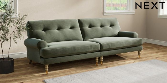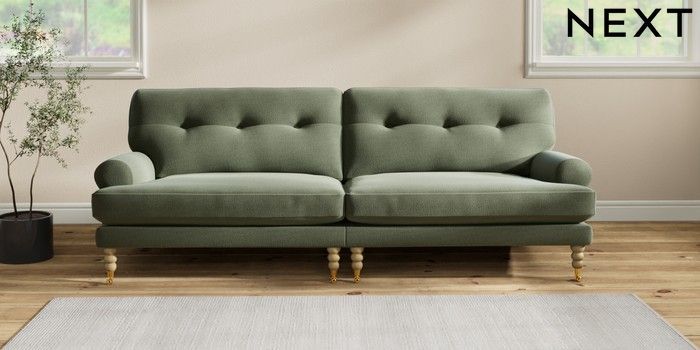 7.2.10 Erin Buttoned Back Deep Relaxed Sit 4 Seater Large Sofa Relaxed Linen Look Dark Green High Classic Turned Brass Castor - Light | Made Click here to use our website with more accessibility support, for example screen readers
