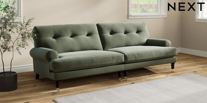 7.2.10 Erin Buttoned Back Deep Relaxed Sit 4 Seater Large Sofa Relaxed Linen Look Dark Green High Classic Turned Chrome Castor - Dark | Made Click here to use our website with more accessibility support, for example screen readers