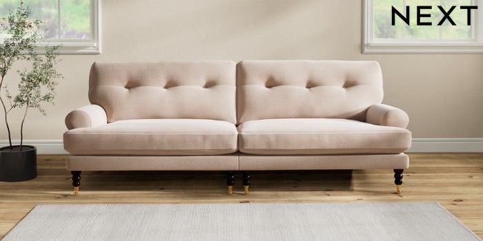 7.2.10 Erin Buttoned Back Deep Relaxed Sit 4 Seater Large Sofa Relaxed Linen Look Mid Natural High Classic Turned Brass Castor - Dark | Made Click here to use our website with more accessibility support, for example screen readers