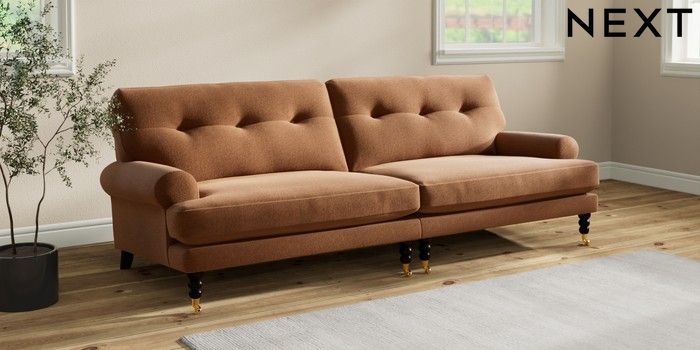 7.2.10 Erin Buttoned Back Deep Relaxed Sit 4 Seater Large Sofa Ripple Chenille Mid Rust Brown High Classic Turned Brass Castor - Dark | Made Click here to use our website with more accessibility support, for example screen readers