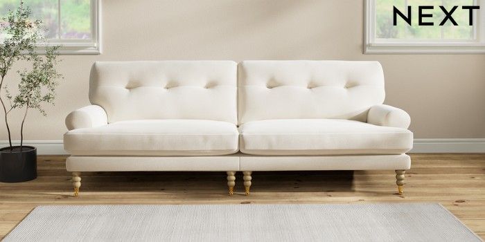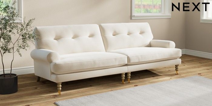 7.2.10 Erin Buttoned Back Deep Relaxed Sit 4 Seater Large Sofa Ripple Chenille Oyster High Classic Turned Brass Castor - Light | Made Click here to use our website with more accessibility support, for example screen readers