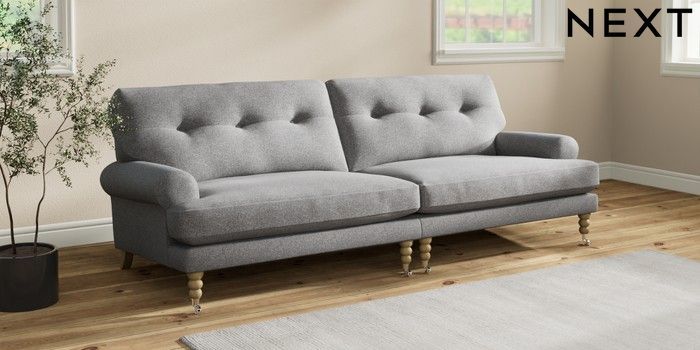 7.2.10 Erin Buttoned Back Deep Relaxed Sit 4 Seater Large Sofa Studio Chenille Mid Grey High Classic Turned Chrome Castor - Light | Made Click here to use our website with more accessibility support, for example screen readers