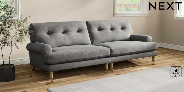 7.2.10 Erin Buttoned Back Deep Relaxed Sit 4 Seater Large Sofa Tweedy Blend Easy Clean Dark Grey High Classic Turned Brass Castor - Light | Made Click here to use our website with more accessibility support, for example screen readers