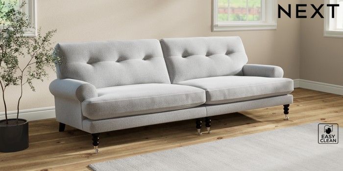 7.2.10 Erin Buttoned Back Deep Relaxed Sit 4 Seater Large Sofa Tweedy Blend Easy Clean Light Silver Grey High Classic Turned Chrome Castor - Dark | Made Click here to use our website with more accessibility support, for example screen readers
